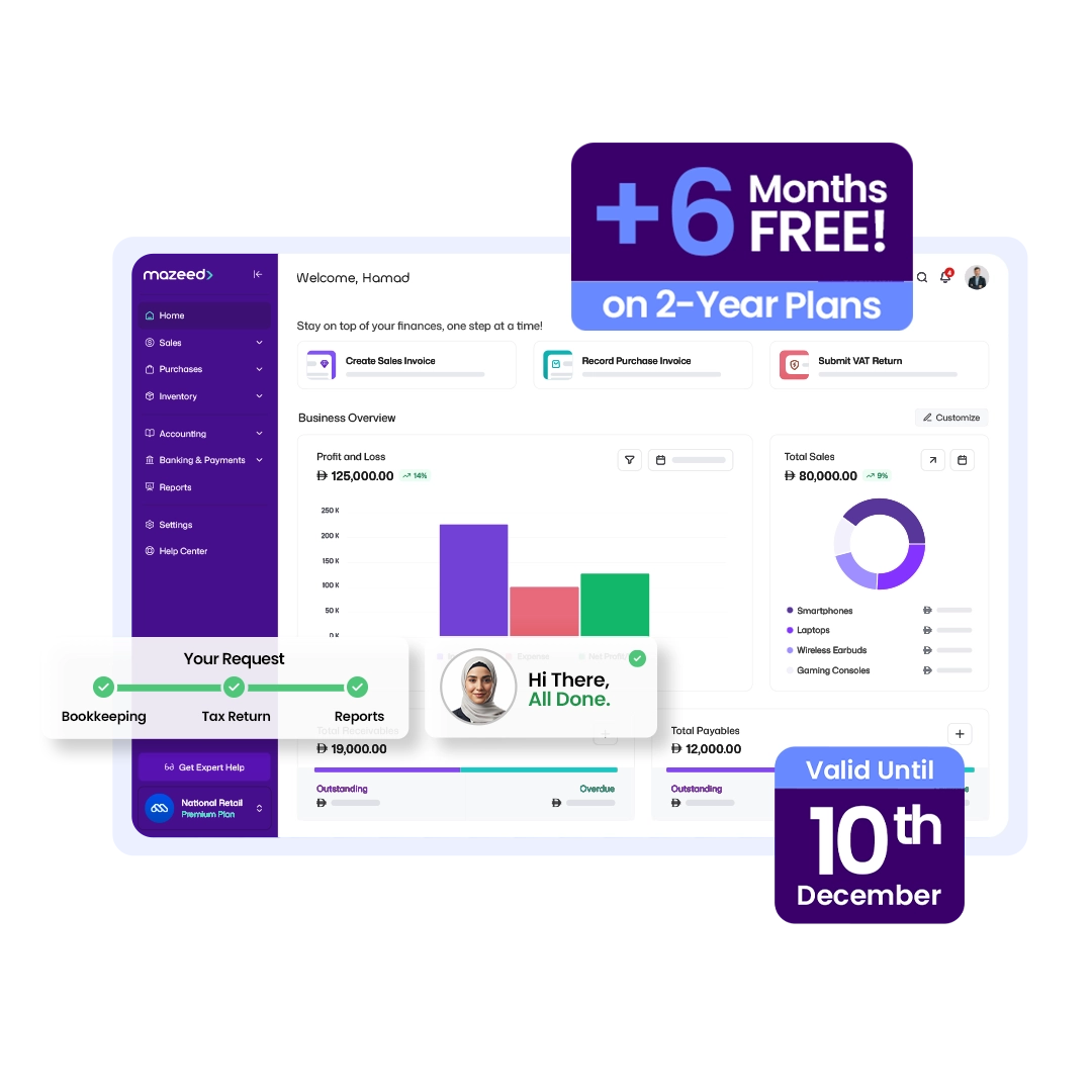 All your accounting is done using mazeed’s FTA-ready software, giving you speed, accuracy, and compliance in one platform.